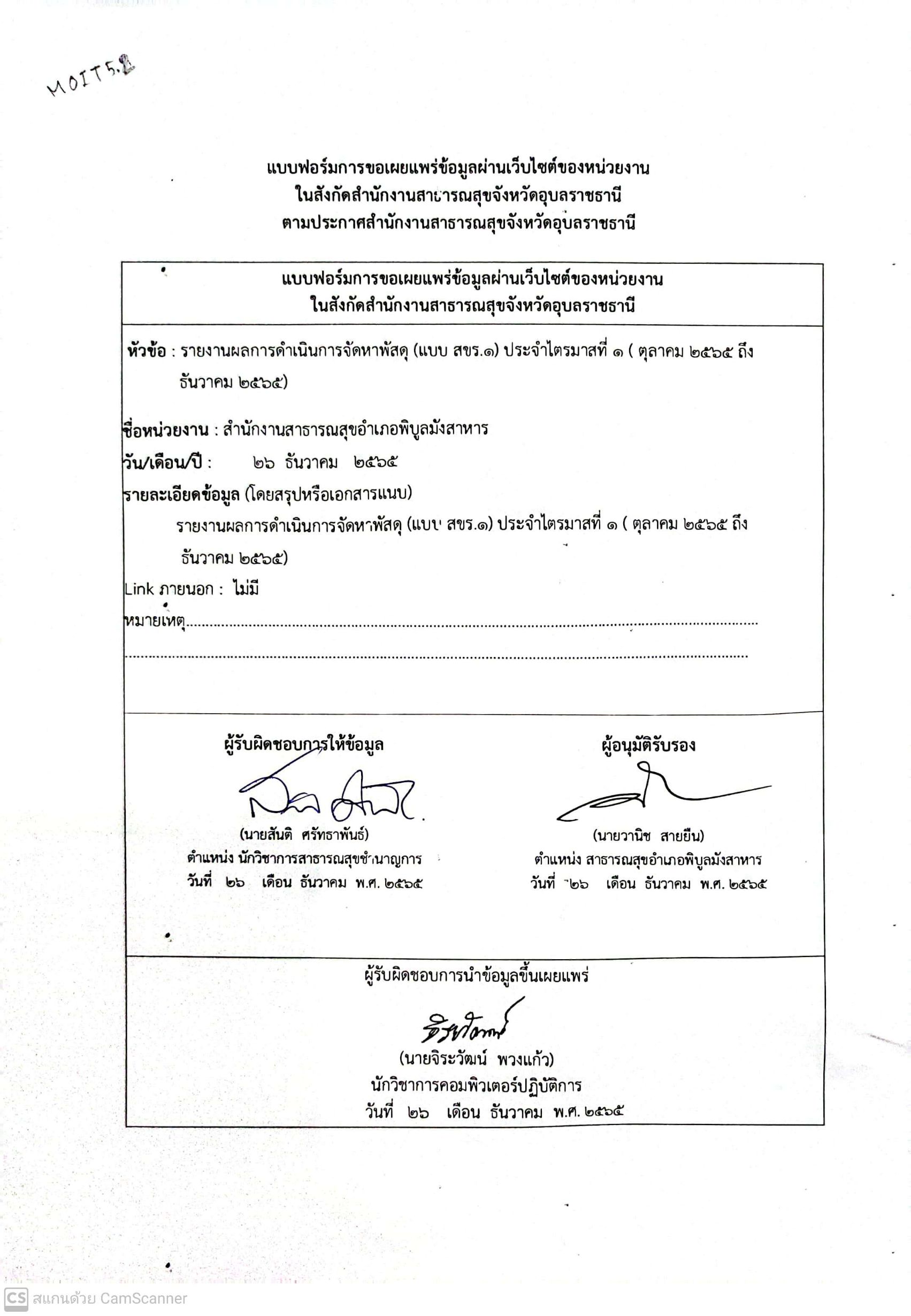 | 1. มีบันทึกข้อความ ที่ผู้บริหารลงนามรับทราบแบบ สขร. 1 ไตรมาสที่ 1 และมีการขออนุญาตนำไปเผยแพร่บนเว็บไชต์ของหน่วยงาน | ดาวน์โหลด |